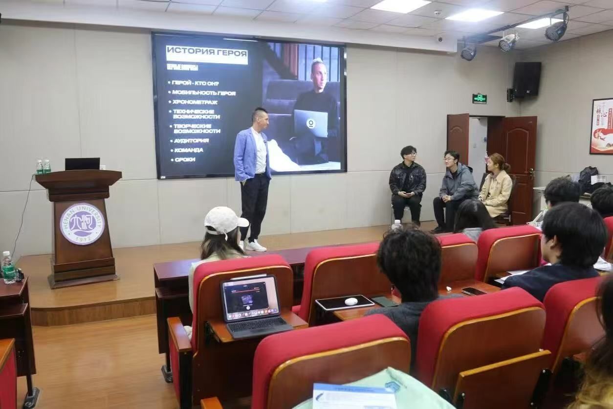 10月17日下午,白俄罗斯国立大学新闻学副教授、纪录片导演、脱口秀主持人奥列格·特里丰诺夫博士应邀为心蕊直播 师生带来一场题为“人物传记拍摄与剪辑”的专题讲座,呈现了一场思想与技艺交融的学术盛宴。学院教师代表、播音与主持艺术专业学生近200人聆听讲座。