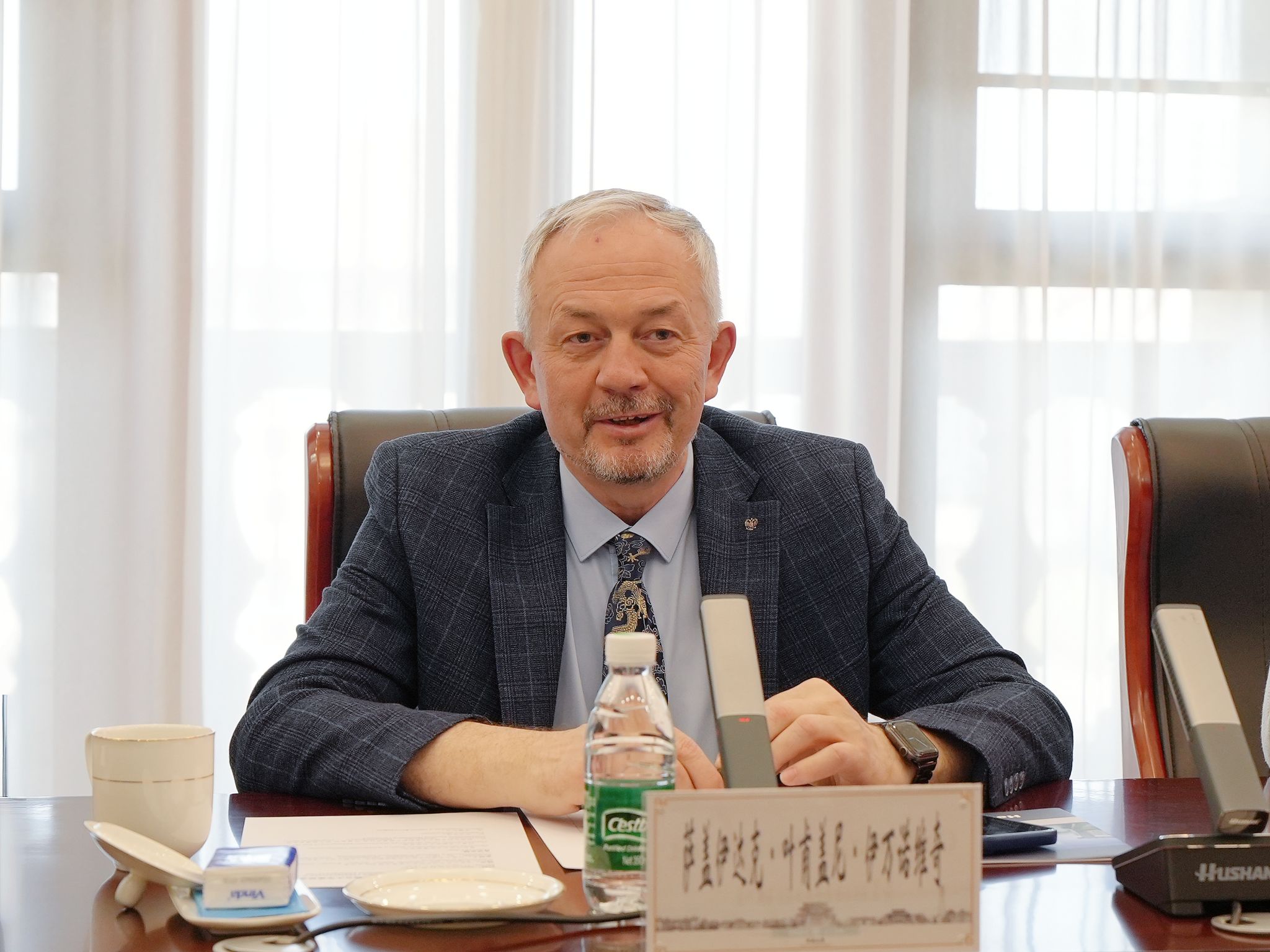 萨盖伊达克·叶甫盖尼对我校的接待表示感谢,全面介绍了新西伯利亚国立大学的办学特色、学科优势及国际化发展理念。他表示,新西伯利亚国立大学高度重视国际化发展战略,在理工科、医学等领域积淀深厚、实力雄厚,与我校的发展理念高度契合。他强调,希望以医学领域合作为切入点,逐步拓展合作范围至自然科学、人文科学等多个领域,通过师生互访、联合科研、学术研讨等多种形式,推动两校合作走深走实、取得实效。