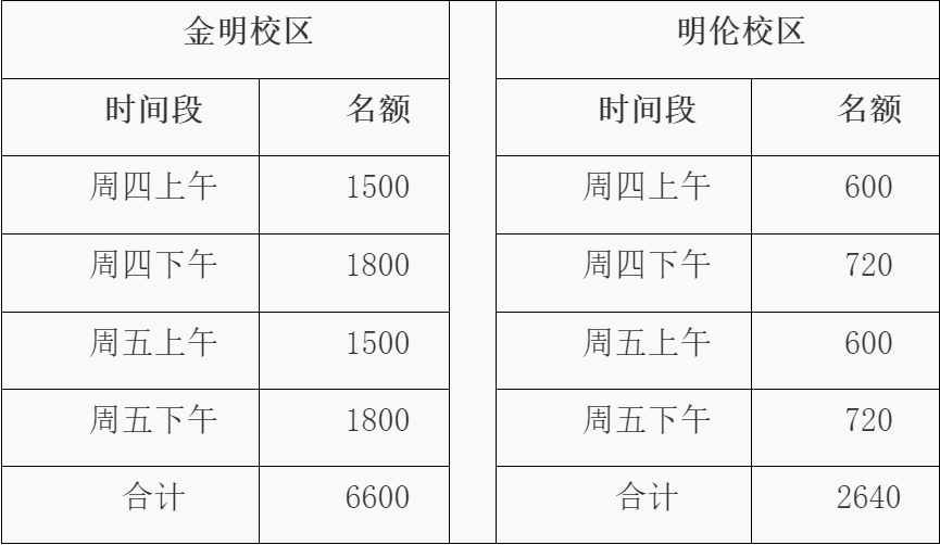 3.根据工作安排,本学期普通话水平测试,每周设置周四上午、周四下午、周五上午和周五下午等4个时间段,上午08:00—12:00,下午13:00—18:00。考生可根据个人时间及所在校区,自行选择参加其中1个时间段的测试。因受机房机位数量限制,各个时间段报名人数实行限额。